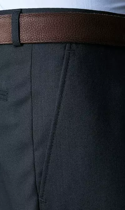 Details zur Hose: Verlängerter Bund, Gerade geschnitten, Paspelierte Pattentasche/n hinten geknöpft, Seitliche Eingrifftaschen, Bügelfalte