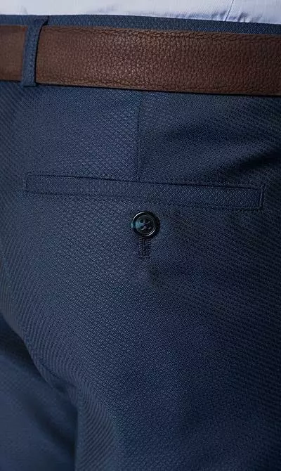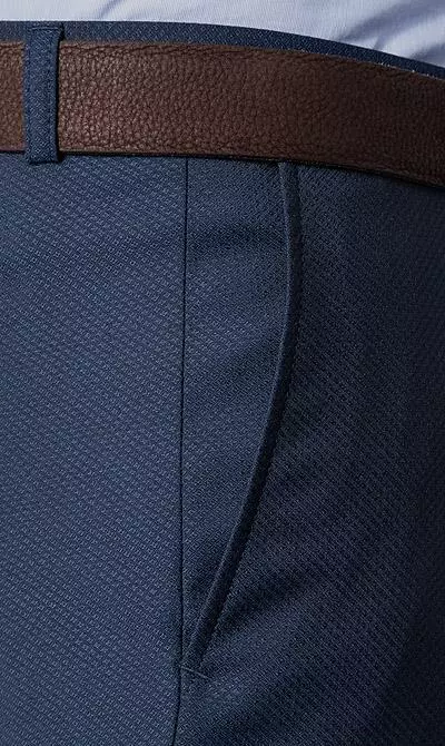 Details zur Hose: Verlängerter Bund, Schmal geschnitten, Aufgesetzte Taschen, Leistentasche/n, Bügelfalte