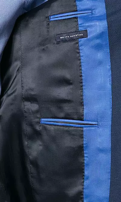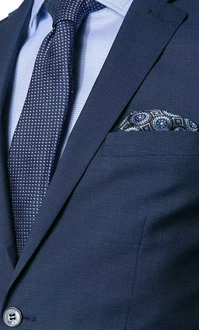 Feines, dezentes Dessin, ein schlanker Schnitt und ein äußerst attraktiver Taschenbeutel – als Einstecktuch verwendbar – machen diesen Anzug zu einem besonders eleganten Modell mit modischem Appeal.