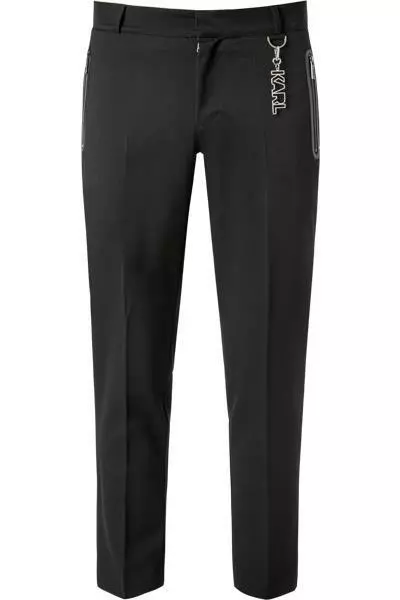 Ein modernes Design und ein klassischer Schnitt machen diese hochwertige Hose aus. Sie lässt sich vielseitig kombinieren und garantiert durch die pflegeleichte und kompakte Twill Qualität besten Tragekomfort. Zwei mit Lederstreifen verzierte Reißverschlusstaschen mit Logo-Zipper, sowie ein abnehmbarer KARL-Anhänger komplettieren das exklusive Gesamtbild.