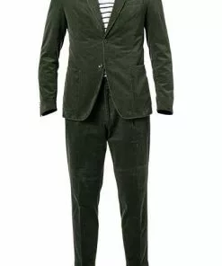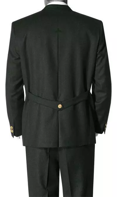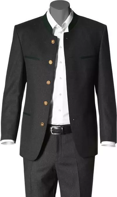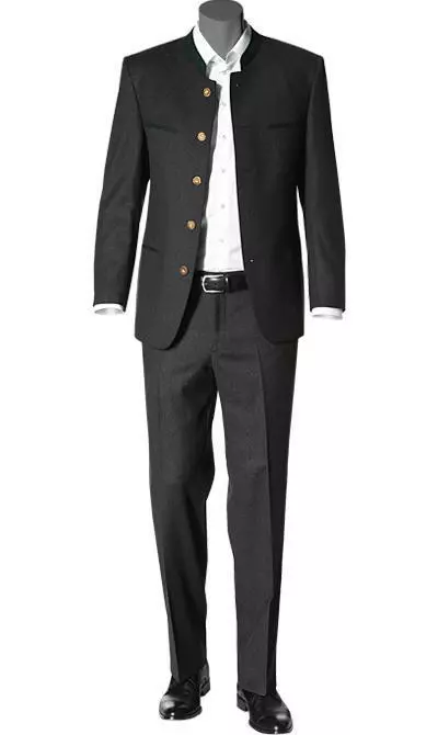 Diesen Anzug in klassischer Trachtenmanier können Sie im Baukasten-System zusammenstellen, also Sakko und Hose jeweils in der Größe, die für Sie am besten passt. Das Sakko ist im traditionellen Tegernseer Stil gearbeitet, mit farblich abgesetztem Stehkragen, Paspeltaschen, Rückenfalte mit Dragoner (geknöpfter Riegel im Rücken) und Hirschhornknöpfen. Die Hose ist eine normal geschnittene Flat Front, ohne Bundfalte, mit französischen Taschen und einer Gesäßpaspeltasche.
