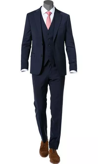 Ein sehr schmal geschnittener, taillierter Dreiteiler, passend für den Business Look ebenso wie für private Termine und Anlässe. Aus einer Wollmischung mit Stretchanteil ist dieses Modell eine optimale Wahl für angenehmen Tragekomfort. Ein Anzug mit Weste, der maskuline Eleganz ausstrahlt und einen smarten Look sowie eine moderne Silhouette verleiht.