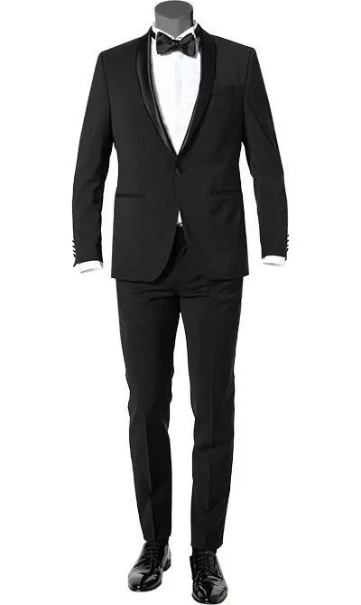 Dieser stilvolle Smoking präsentiert sich in hochwertiger Schurwolle. Die leicht schmale und taillierte Passform unterstreicht die modische Silhouette. Ein exklusiver und außergewöhnlich eleaganter Anzug für Abendveranstaltungen mit Dresscode.