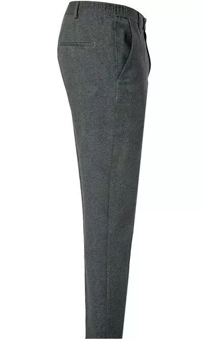 Details zur Hose: Verlängerter Bund mit seitlichen Elastik-Einsätzen und Tunnelzug innen, Schmal geschnitten, Leistentasche/n hinten, Seitliche Eingrifftaschen, Bügelfalte