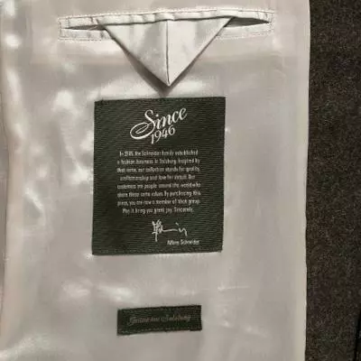 Maße: Bei Größe 50 Rückenlänge ohne Kragen gemessen ca. 60 cm, Brustweite ca. 104 cm